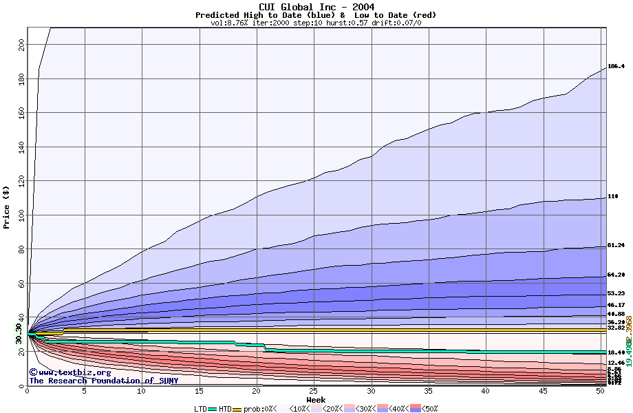The high to date and low to date prices of the stock plotted against a random walk model for 2004 (what's this?).