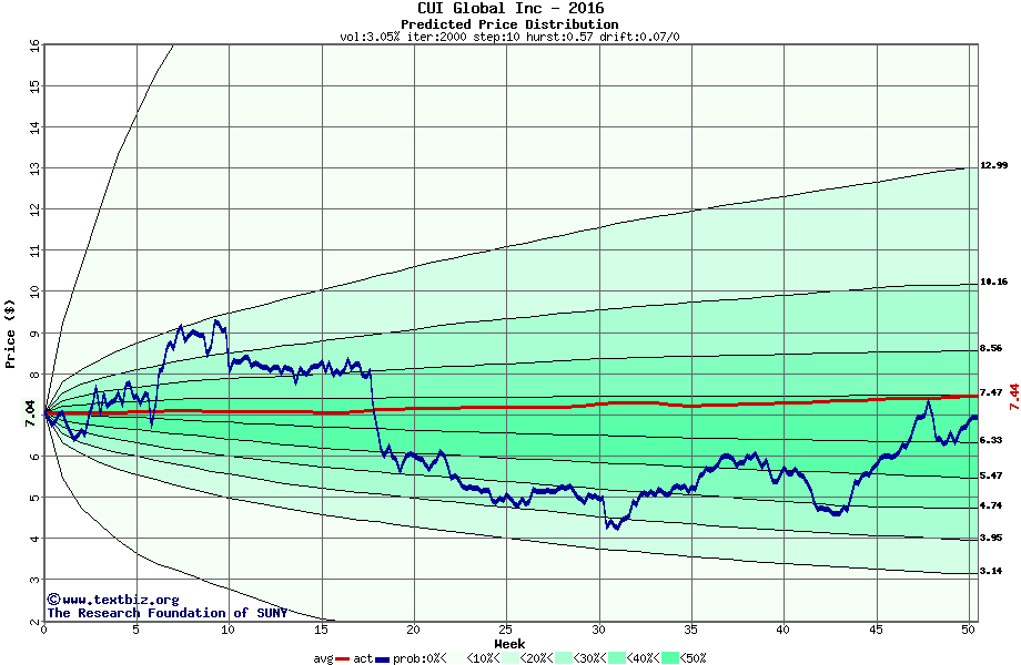 The following graph plots the year-to-date performance of the stock for 2016 compared to the probability calculated by a random walk model.