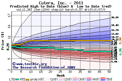 The high to date and low to date prices of the stock plotted against a random walk model for 2011 (what's this?).