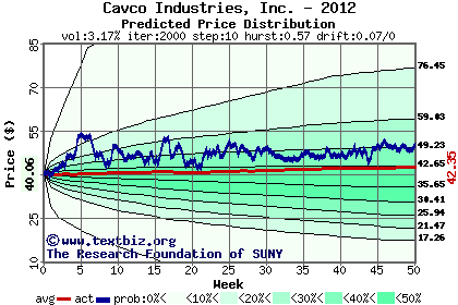 The high to date and low to date prices of the stock plotted against a random walk model for 2012 (what's this?).