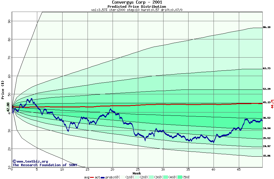 The following graph plots the year-to-date performance of the stock for 2001 compared to the probability calculated by a random walk model.