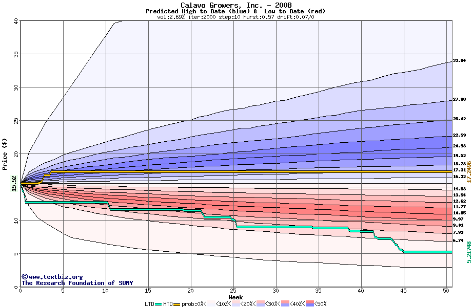 The high to date and low to date prices of the stock plotted against a random walk model for 2008 (what's this?).