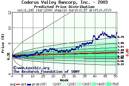 The high to date and low to date prices of the stock plotted against a random walk model for 2003 (what's this?).
