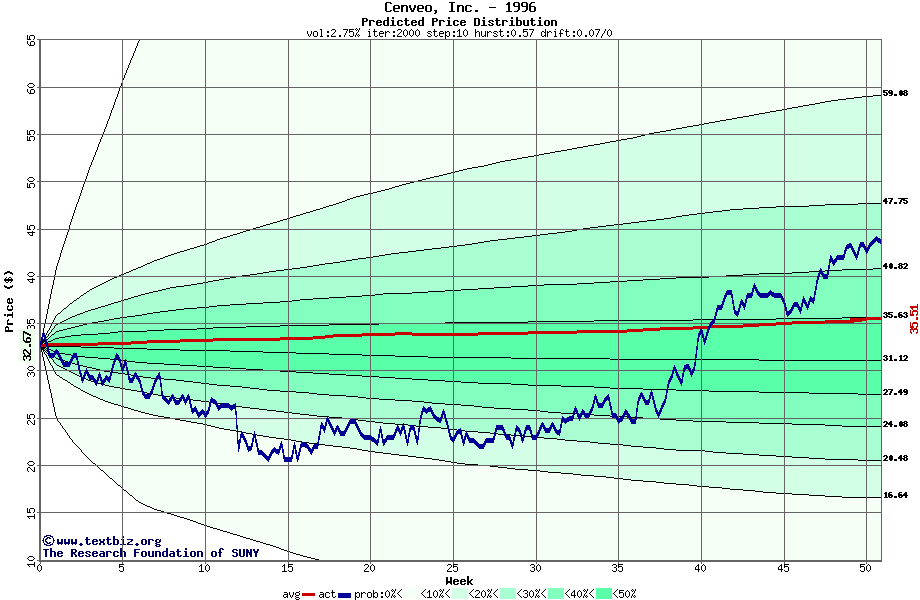 The following graph plots the year-to-date performance of the stock for 1996 compared to the probability calculated by a random walk model.