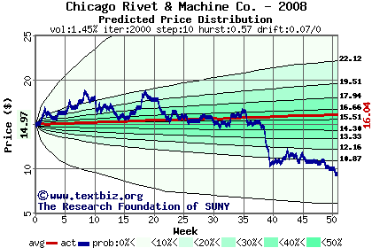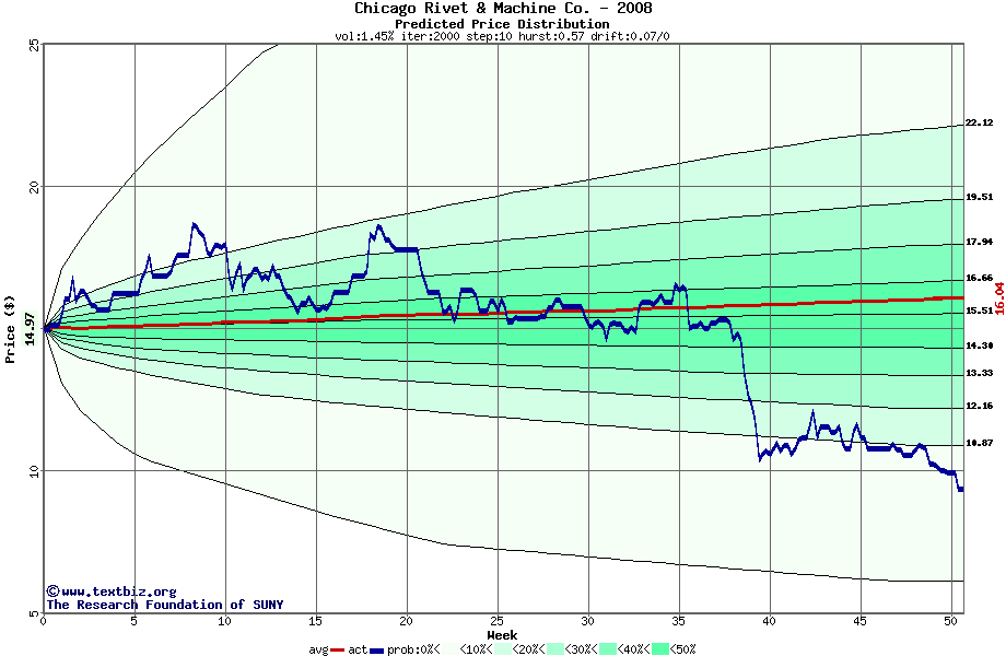 The following graph plots the year-to-date performance of the stock for 2008 compared to the probability calculated by a random walk model.