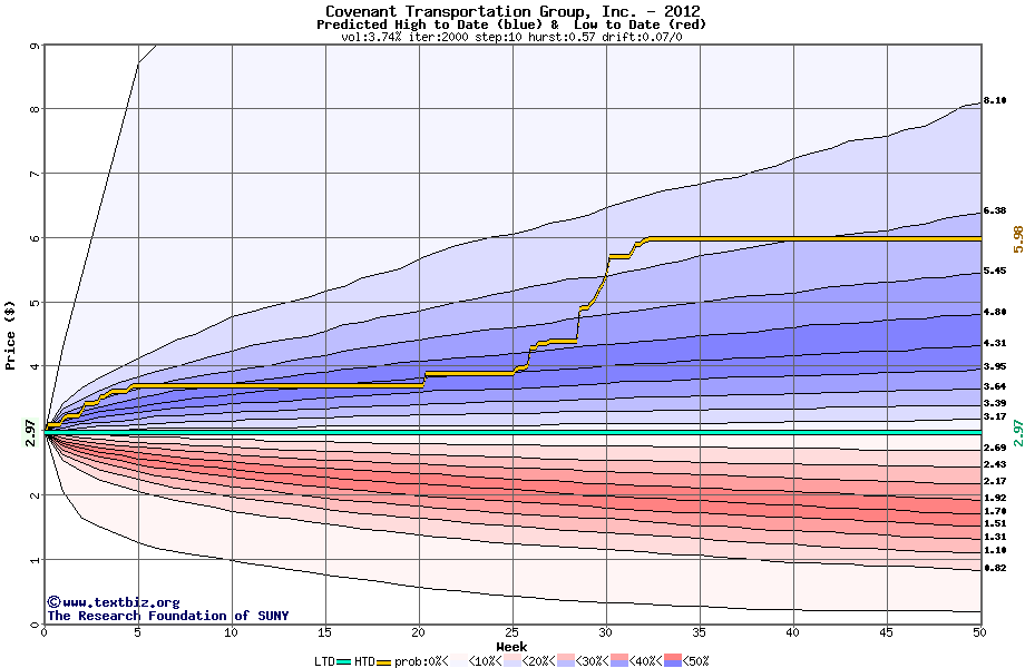 The high to date and low to date prices of the stock plotted against a random walk model for 2012 (what's this?).