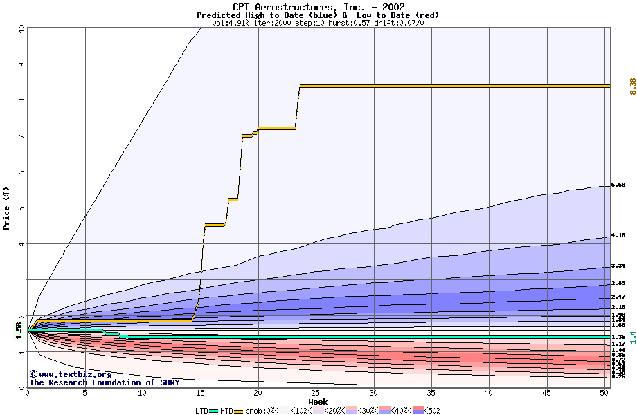 The high to date and low to date prices of the stock plotted against a random walk model for 2002 (what's this?).