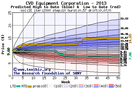 The high to date and low to date prices of the stock plotted against a random walk model for 2013 (what's this?).