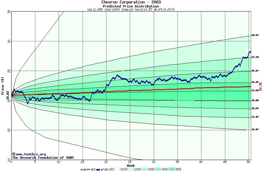 The following graph plots the year-to-date performance of the stock for 2003 compared to the probability calculated by a random walk model.