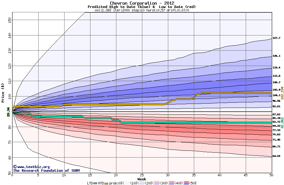 The following graph plots the year-to-date performance of the stock for 2012 compared to the probability calculated by a random walk model.