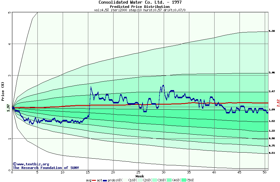 The following graph plots the year-to-date performance of the stock for 1997 compared to the probability calculated by a random walk model.