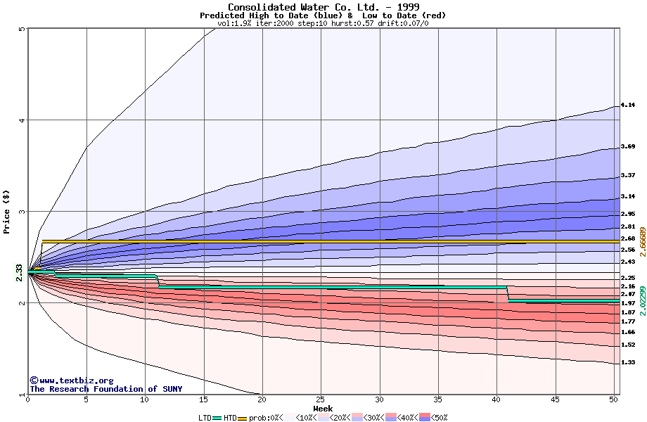 The high to date and low to date prices of the stock plotted against a random walk model for 1999 (what's this?).