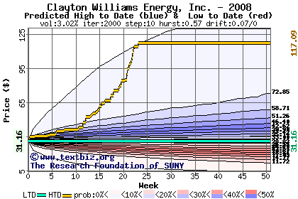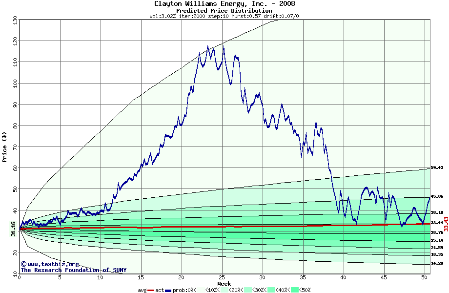 The following graph plots the year-to-date performance of the stock for 2008 compared to the probability calculated by a random walk model.