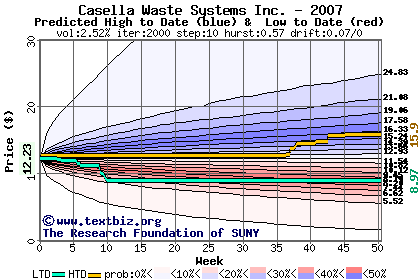 The high to date and low to date prices of the stock plotted against a random walk model for 2007 (what's this?).