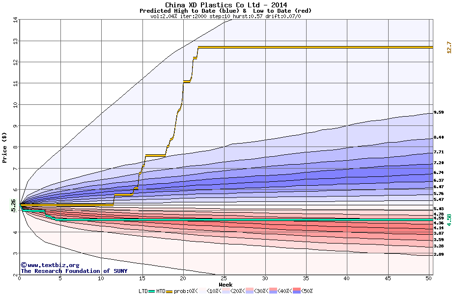 The high to date and low to date prices of the stock plotted against a random walk model for 2014 (what's this?).