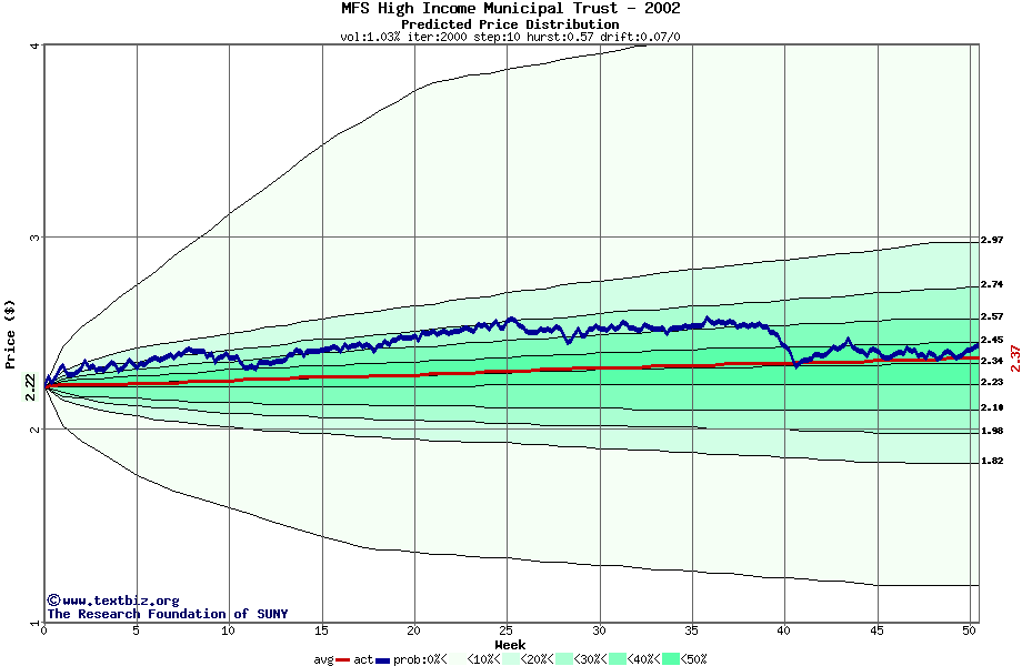 The high to date and low to date prices of the stock plotted against a random walk model for 2002 (what's this?).