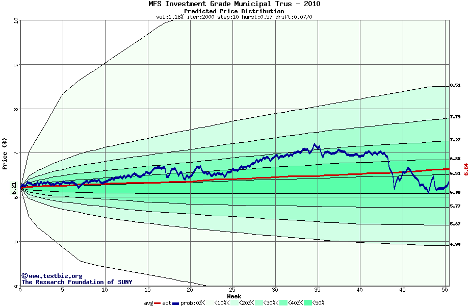 The high to date and low to date prices of the stock plotted against a random walk model for 2010 (what's this?).