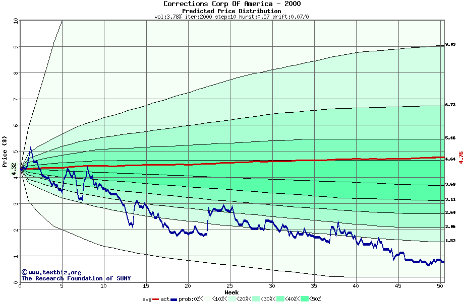The high to date and low to date prices of the stock plotted against a random walk model for 2000 (what's this?).