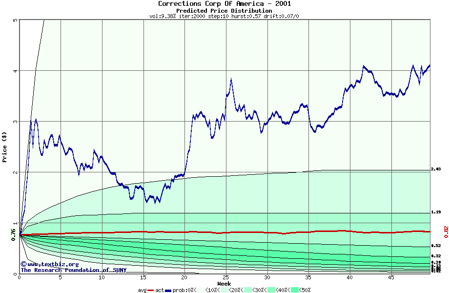 The high to date and low to date prices of the stock plotted against a random walk model for 2001 (what's this?).