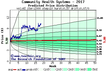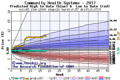 The high to date and low to date prices of the stock plotted against a random walk model for 2017 (what's this?).