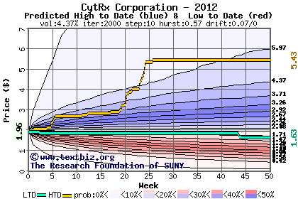 The high to date and low to date prices of the stock plotted against a random walk model for 2012 (what's this?).