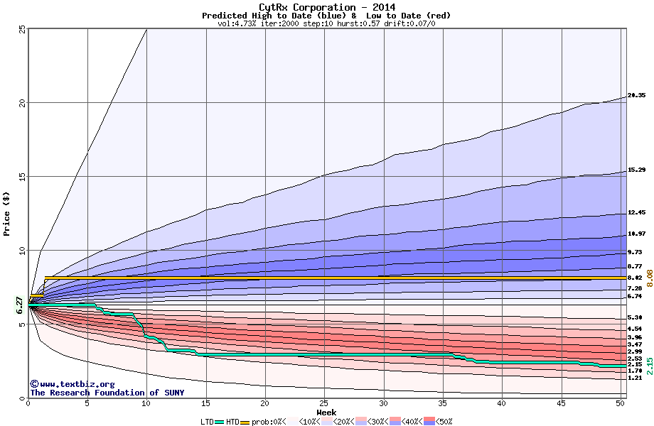 The high to date and low to date prices of the stock plotted against a random walk model for 2014 (what's this?).