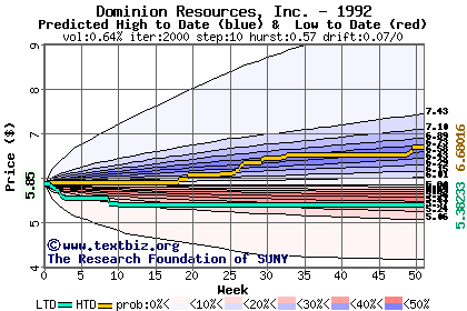 The high to date and low to date prices of the stock plotted against a random walk model for 1992 (what's this?).