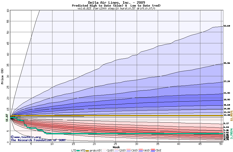 The high to date and low to date prices of the stock plotted against a random walk model for 2009 (what's this?).