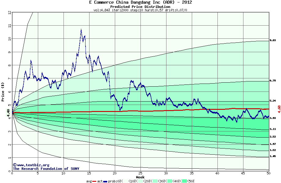 The following graph plots the year-to-date performance of the stock for 2012 compared to the probability calculated by a random walk model.