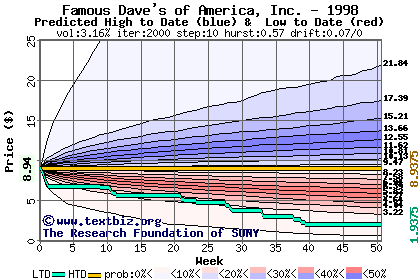 The high to date and low to date prices of the stock plotted against a random walk model for 1998 (what's this?).