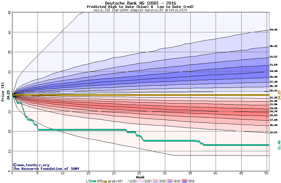 The high to date and low to date prices of the stock plotted against a random walk model for 2016 (what's this?).
