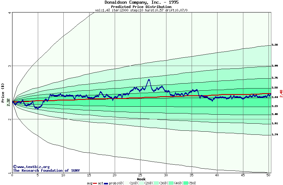The following graph plots the year-to-date performance of the stock for 1995 compared to the probability calculated by a random walk model.