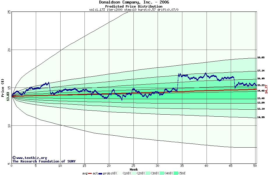 The high to date and low to date prices of the stock plotted against a random walk model for 2006 (what's this?).
