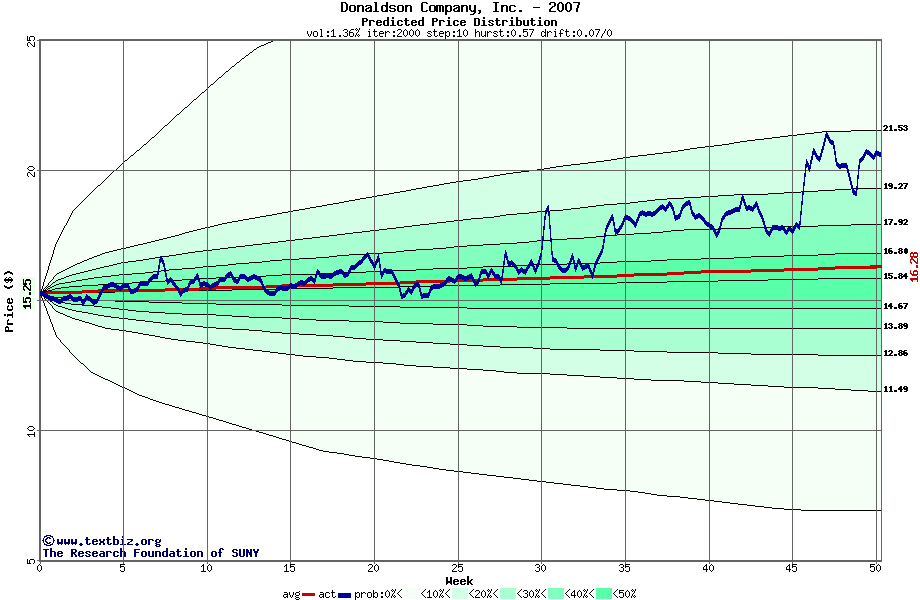 The following graph plots the year-to-date performance of the stock for 2007 compared to the probability calculated by a random walk model.