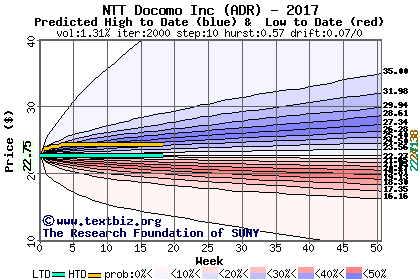 The high to date and low to date prices of the stock plotted against a random walk model for 2017 (what's this?).