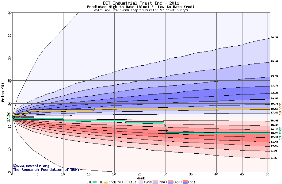The high to date and low to date prices of the stock plotted against a random walk model for 2011 (what's this?).