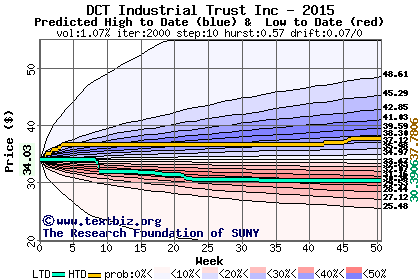 The high to date and low to date prices of the stock plotted against a random walk model for 2015 (what's this?).