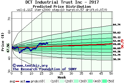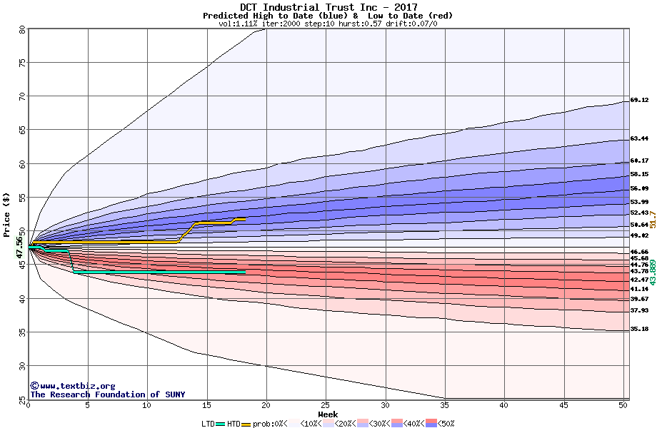 The high to date and low to date prices of the stock plotted against a random walk model for 2017 (what's this?).