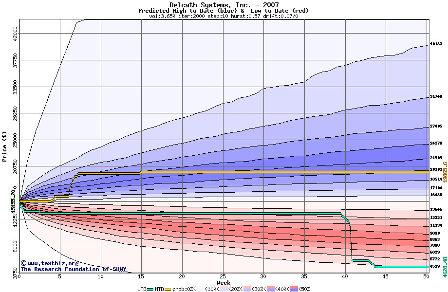 The high to date and low to date prices of the stock plotted against a random walk model for 2007 (what's this?).
