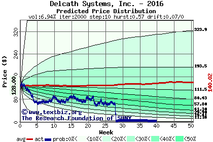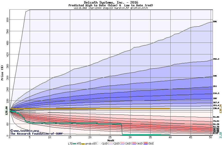 The high to date and low to date prices of the stock plotted against a random walk model for 2016 (what's this?).