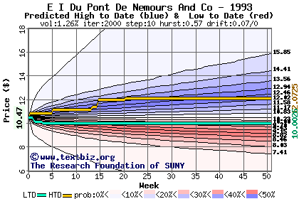 The high to date and low to date prices of the stock plotted against a random walk model for 1993 (what's this?).