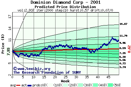 The high to date and low to date prices of the stock plotted against a random walk model for 2001 (what's this?).