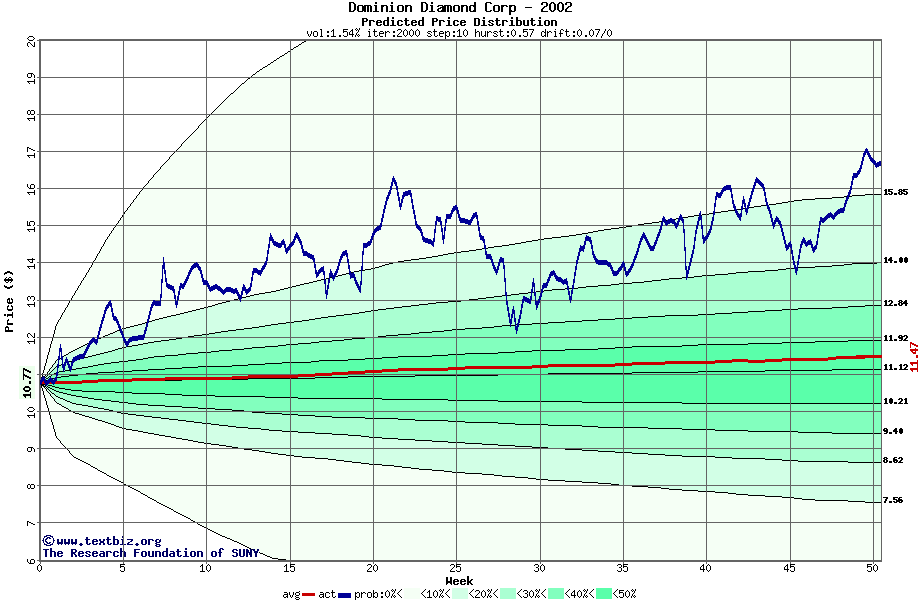 The high to date and low to date prices of the stock plotted against a random walk model for 2002 (what's this?).