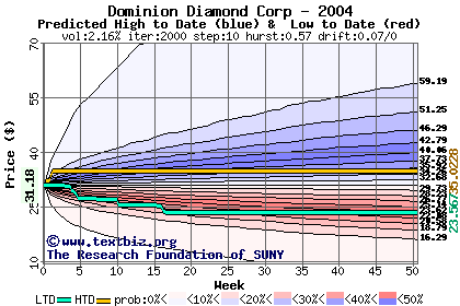 The high to date and low to date prices of the stock plotted against a random walk model for 2004 (what's this?).