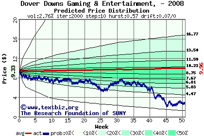 The high to date and low to date prices of the stock plotted against a random walk model for 2008 (what's this?).