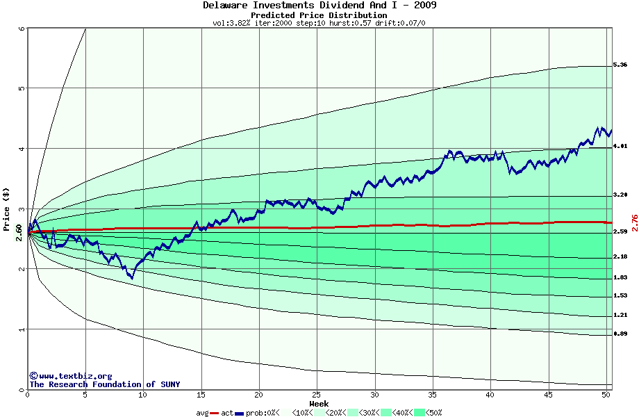 The high to date and low to date prices of the stock plotted against a random walk model for 2009 (what's this?).