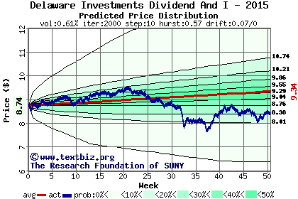 The high to date and low to date prices of the stock plotted against a random walk model for 2015 (what's this?).