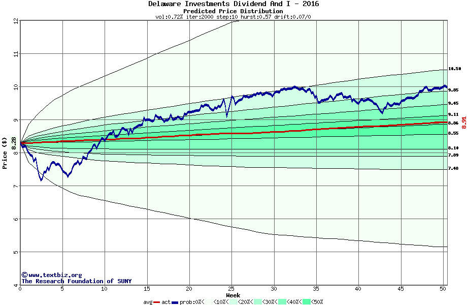 The high to date and low to date prices of the stock plotted against a random walk model for 2016 (what's this?).