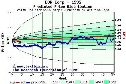 The high to date and low to date prices of the stock plotted against a random walk model for 1995 (what's this?).