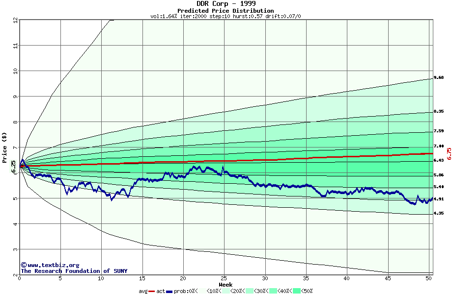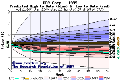 The high to date and low to date prices of the stock plotted against a random walk model for 1999 (what's this?).